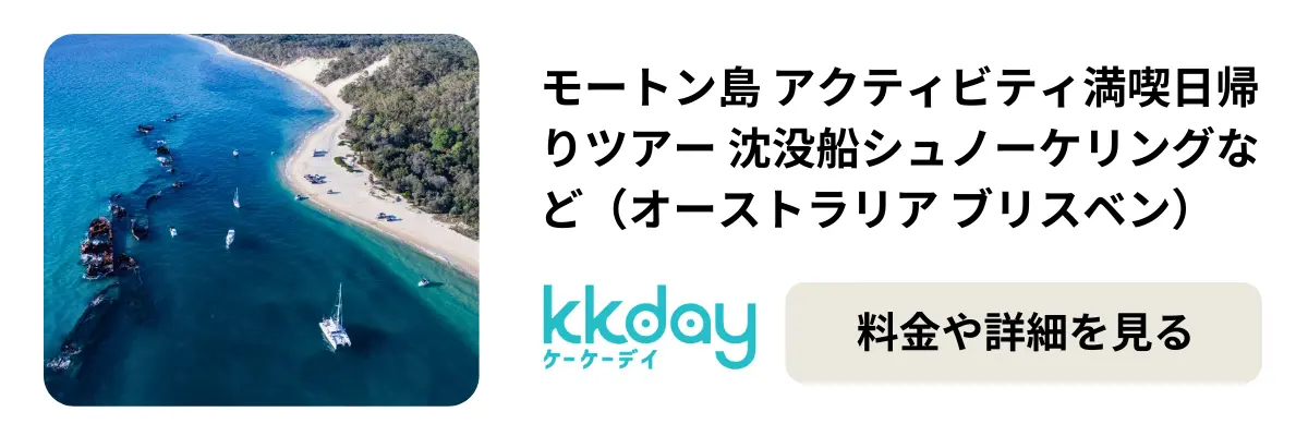 【移動のヒント】 ブリスベンのホルト・ストリート・ワーフ(Holt Street Wharf)からフェリーで約75分。港までは少し離れているので、KKdayで予約する際に「市内送迎付き」のプランを選んでおけば、不慣れな場所でも迷う心配ゼロで楽しめます。