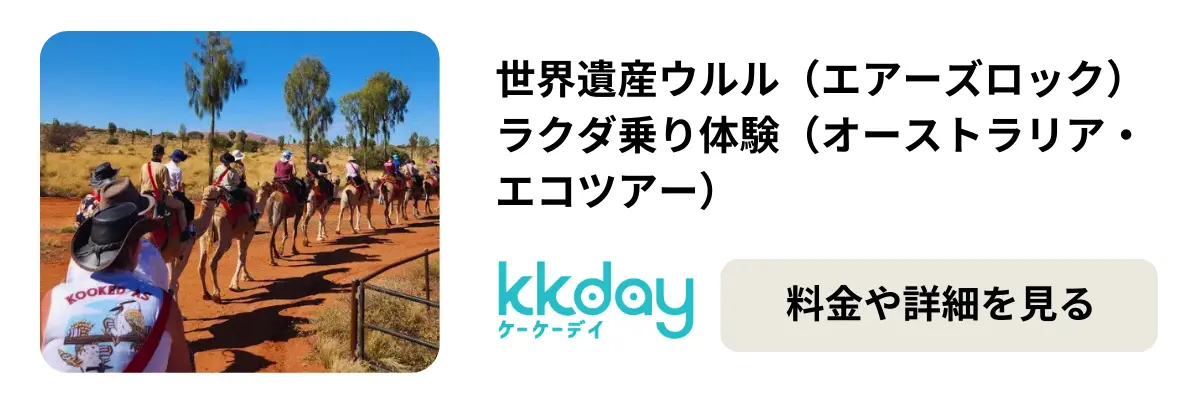【移動のヒント】 ウルル周辺の宿泊施設が集まる「エアーズロック・リゾート」から、各ツアーの送迎バスが出ています。ウルル周辺は個人での移動が非常に難しいため、KKdayで送迎込みのツアーを予約しておくのが鉄則です。特にサンライズ・サンセット枠は数ヶ月前から埋まるので、航空券を取ったら即確保、が正解です。