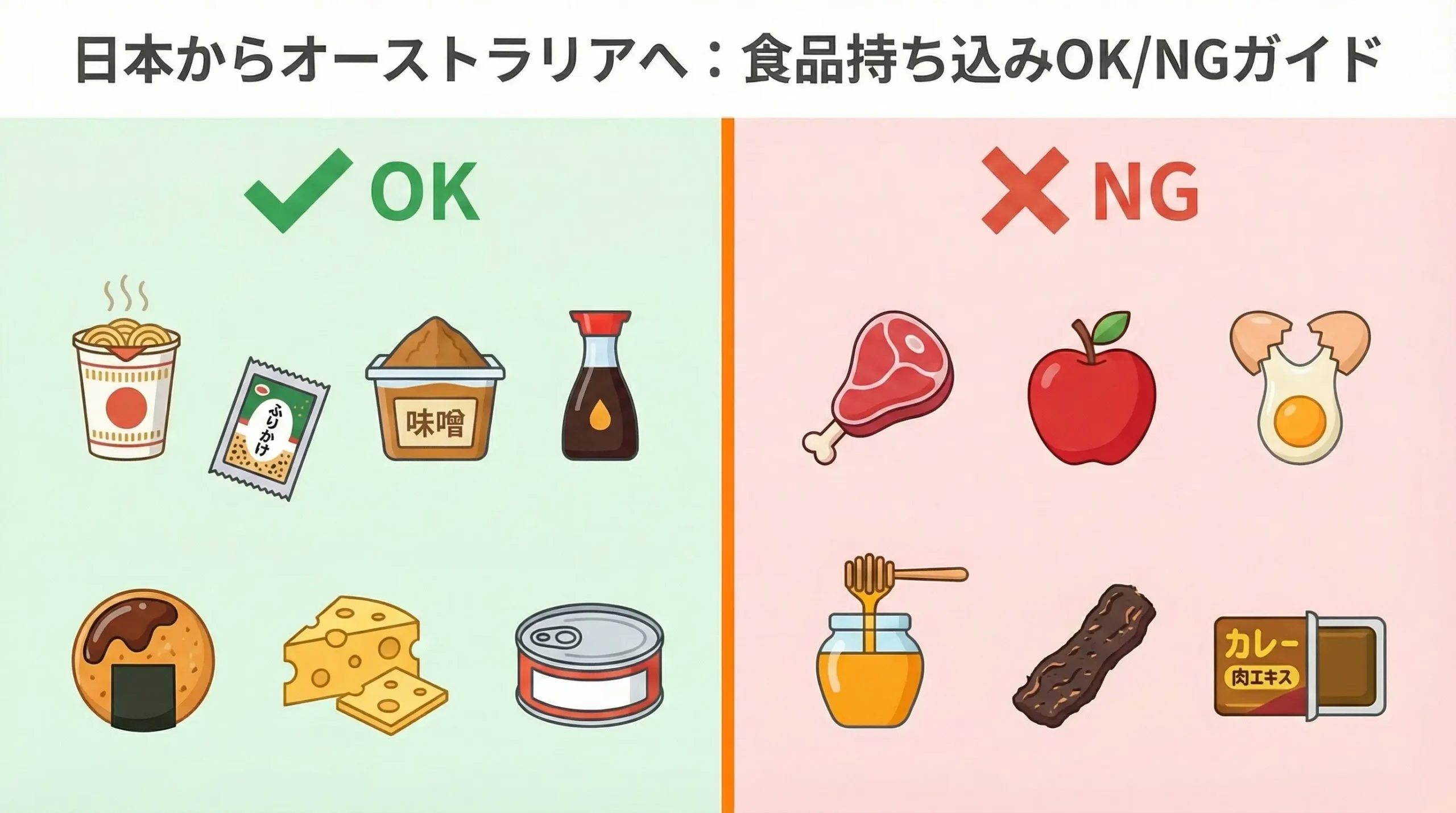 この記事では、オーストラリアに持ち込めない物を「完全に禁止」「条件付きでOK」「申告不要」の3つに分けて、品目ごとにわかりやすく整理しました。