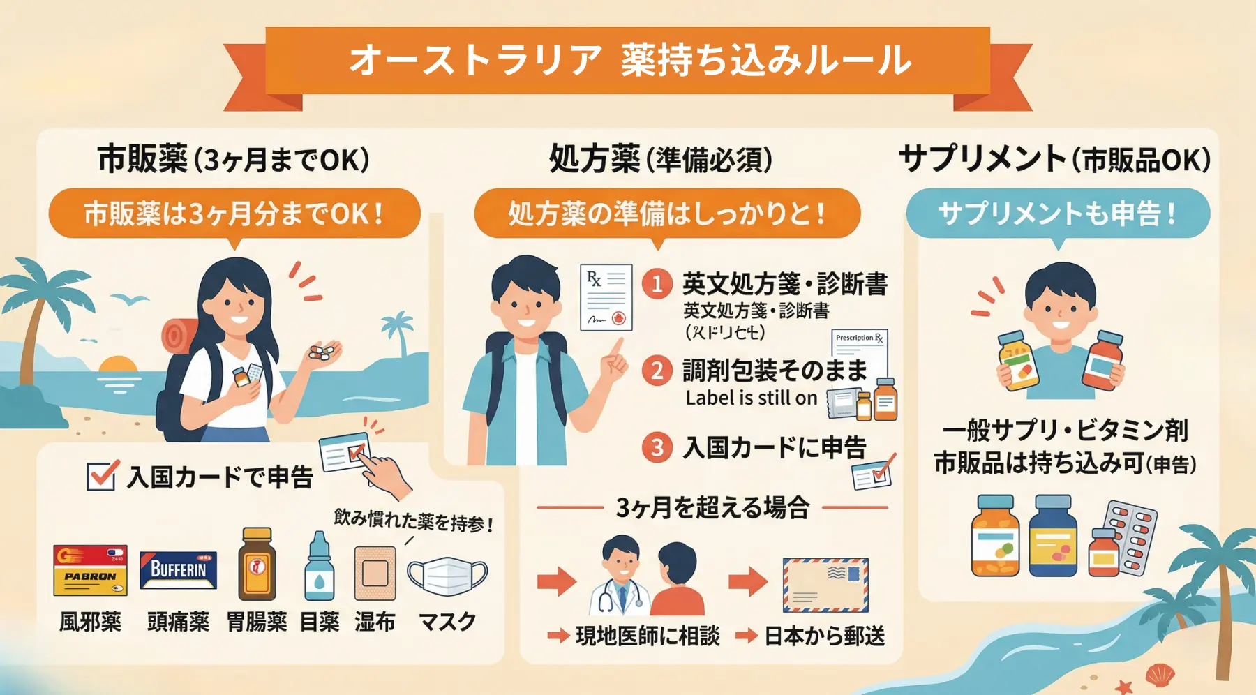 • 薬は3ヶ月分以内なら持ち込みOK。処方薬は英文処方箋を準備