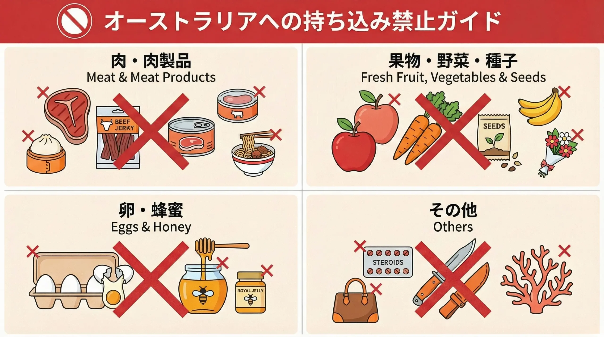 • 完全禁止品(生肉・生の果物野菜・全卵・蜂蜜など)は荷物に入れない