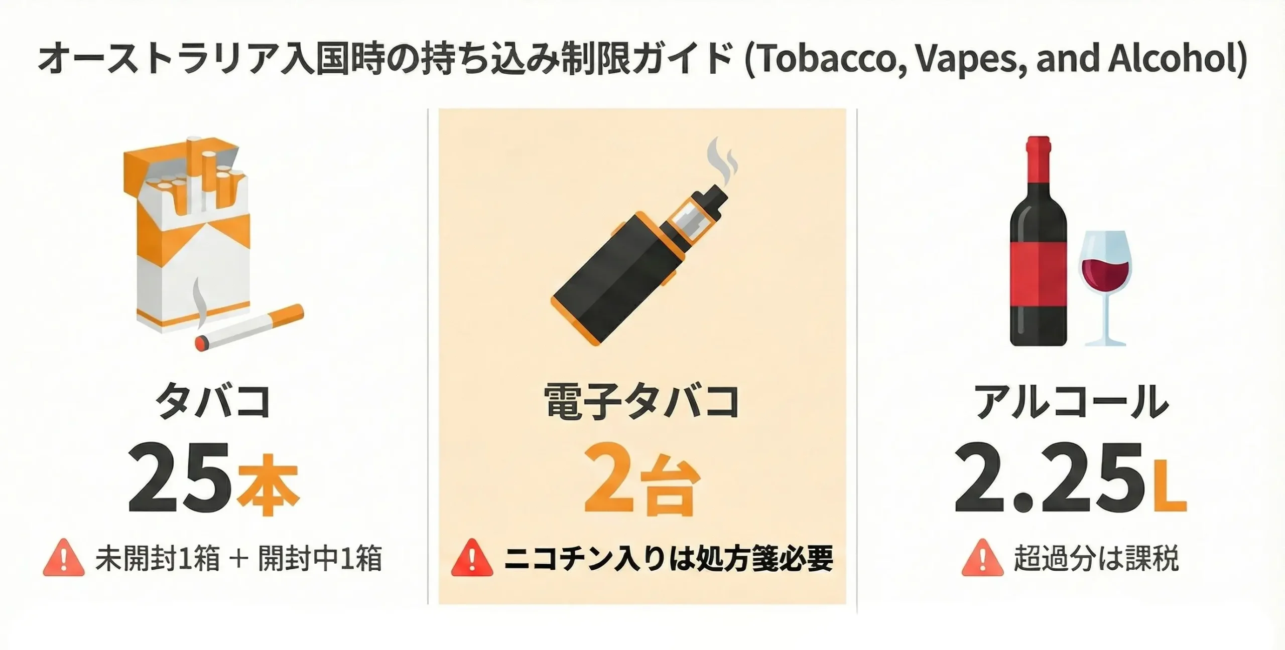 オーストラリアのタバコ価格は1箱約AU$50〜70(約5,000〜7,000円)と非常に高額なので、喫煙者は免税枠を最大限活用したくなると思いますが、ルールは厳格です。