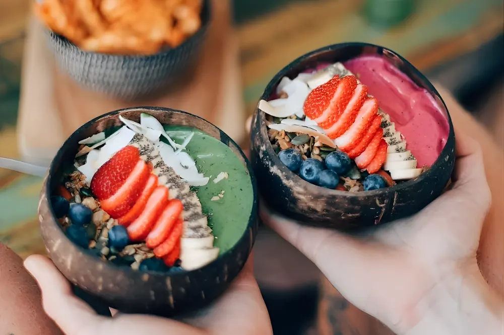 甘さは控えめで、フレッシュなフルーツにナッツやシードがたっぷり。見た目も美しく、味も栄養も妥協しない一杯です。