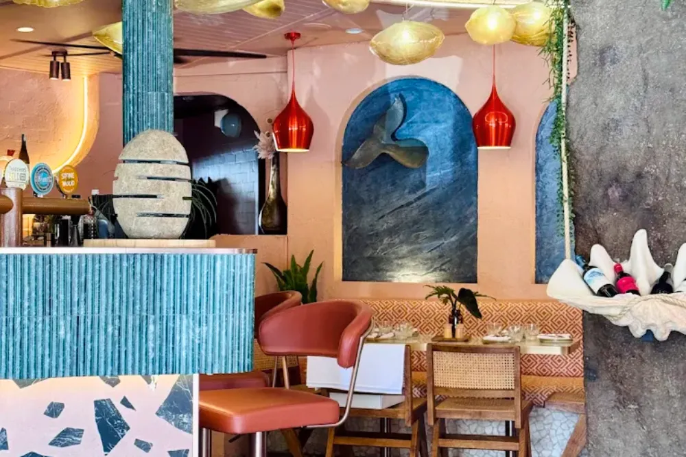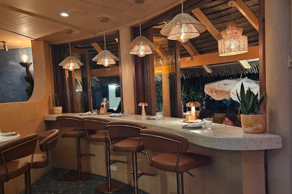 ヤシの木に囲まれた店内は、南国の海辺らしい雰囲気を思わせる開放的な空間。