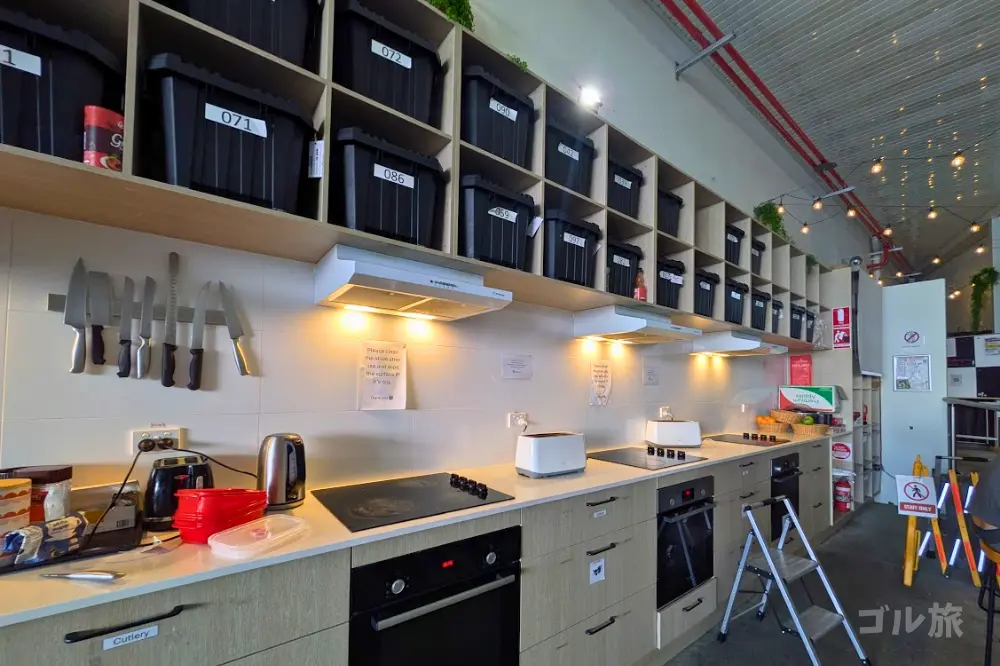 キッチンはコンパクトながら清潔に保たれていて、調理器具も一通り揃っています。自炊派の旅行者や長期滞在の人にとってはありがたい設備です。