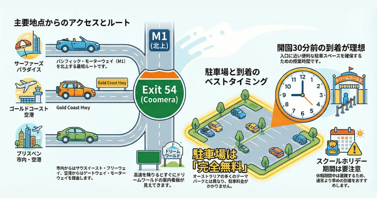 ドリームワールドは、ゴールドコーストの中心部(サーファーズパラダイス)からは少し北に離れた場所にあります。でも、アクセスは思ったより簡単。車・公共交通機関・シャトルバスの3パターンを紹介します。