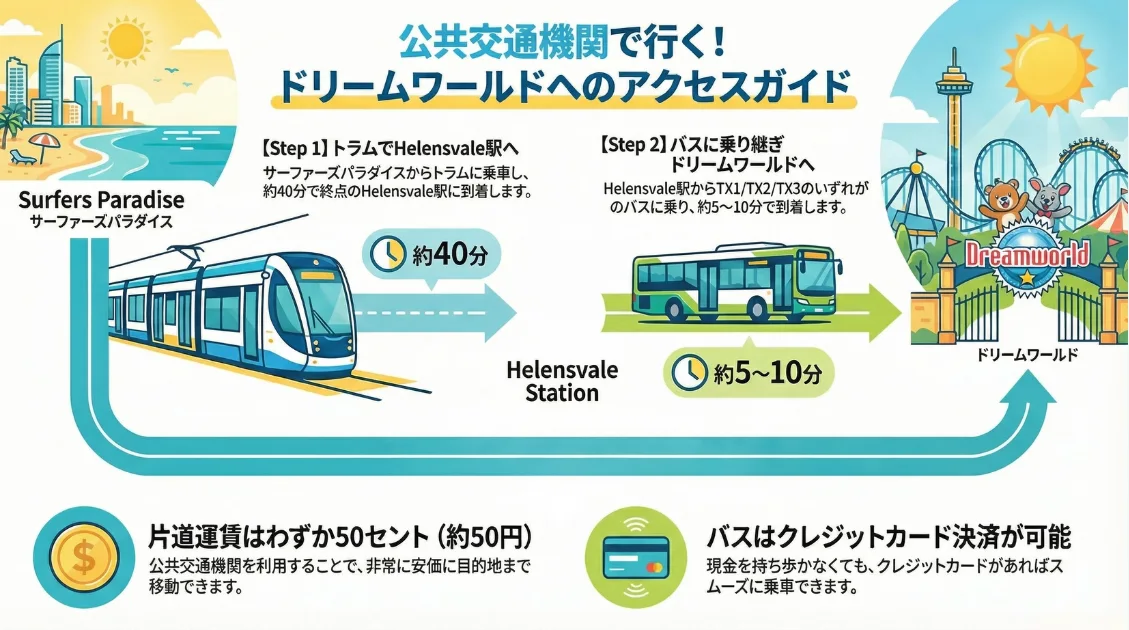 - Helensvale駅でバス(TX1/TX2/TX3のいずれか)に乗車し、ドリームワールド前で下車(約5〜10分)