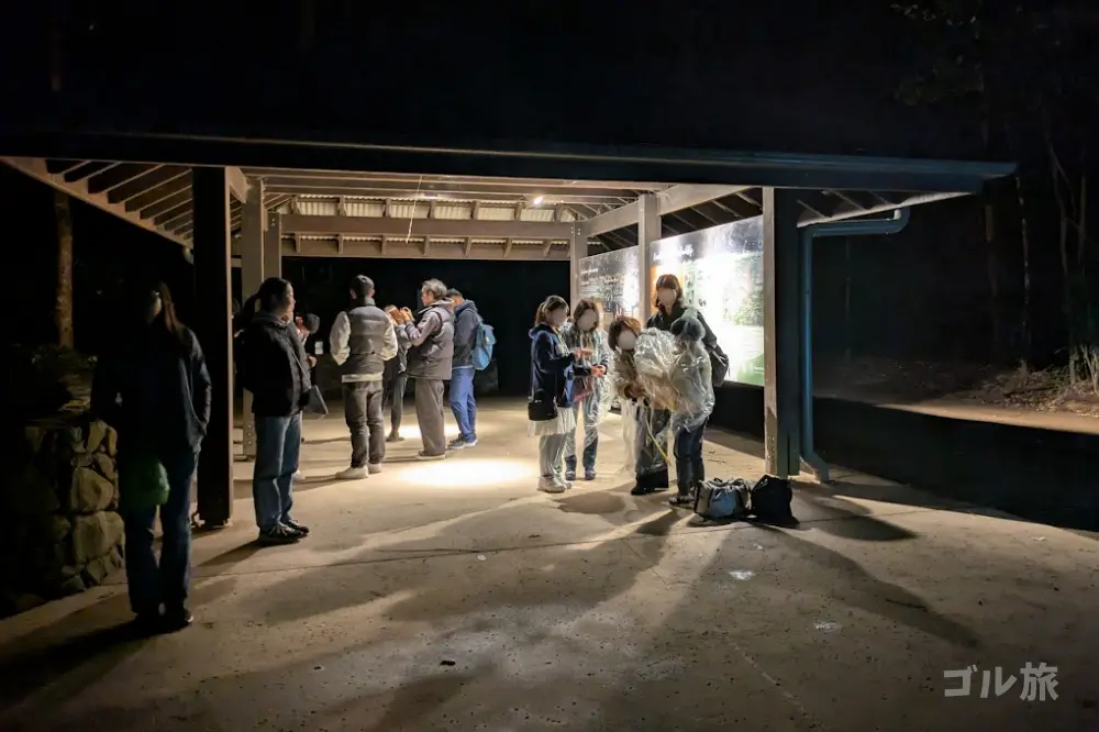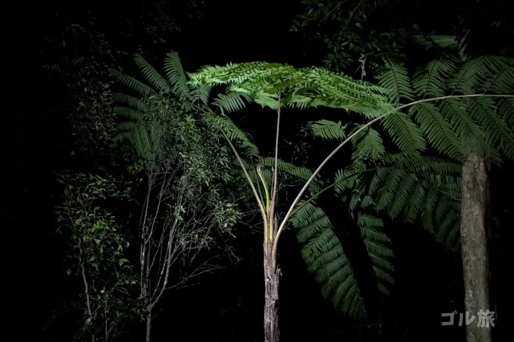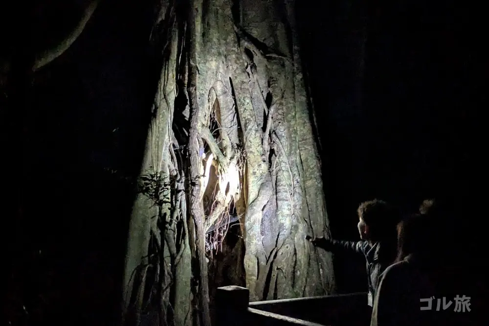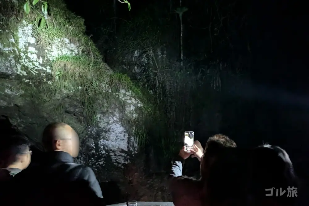 森の中はひんやりとしていて、虫やカエルの鳴き声だけが響きます。足元をライトで最小限照らしながら、ガイドさんの後ろをゆっくり進みます。