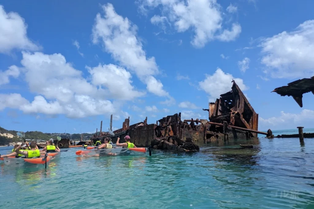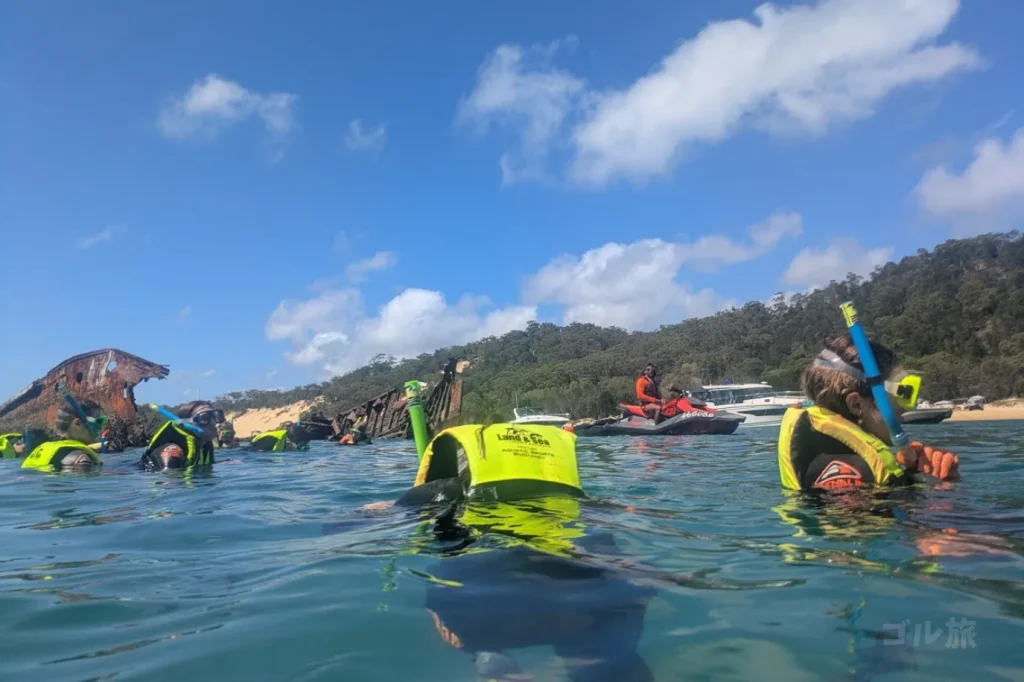 沈没船のシルエットや、その周りを泳ぐ魚たちを、海に入らずに観察できます。のんびり浮かんでいるイメージで参加しましたが、終わってみると腕と背中はしっかり運動した感覚。アクティブに海を楽しみたい人にはぴったりです。