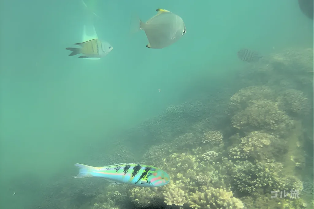 この日の海は「超クリア!」というほどではなかったものの、沈没船のディテールや魚の群れがきちんと見えるくらいの透明度。運が良い日にはジュゴンに出会えることもあるそうです。