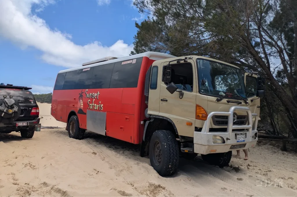 四輪駆動のバスに乗って砂漠エリアへ向かいます。完全オフロードの森をガタガタ進んでいくので、車酔いしやすい方は事前に酔い止めを飲んでおくと安心です。